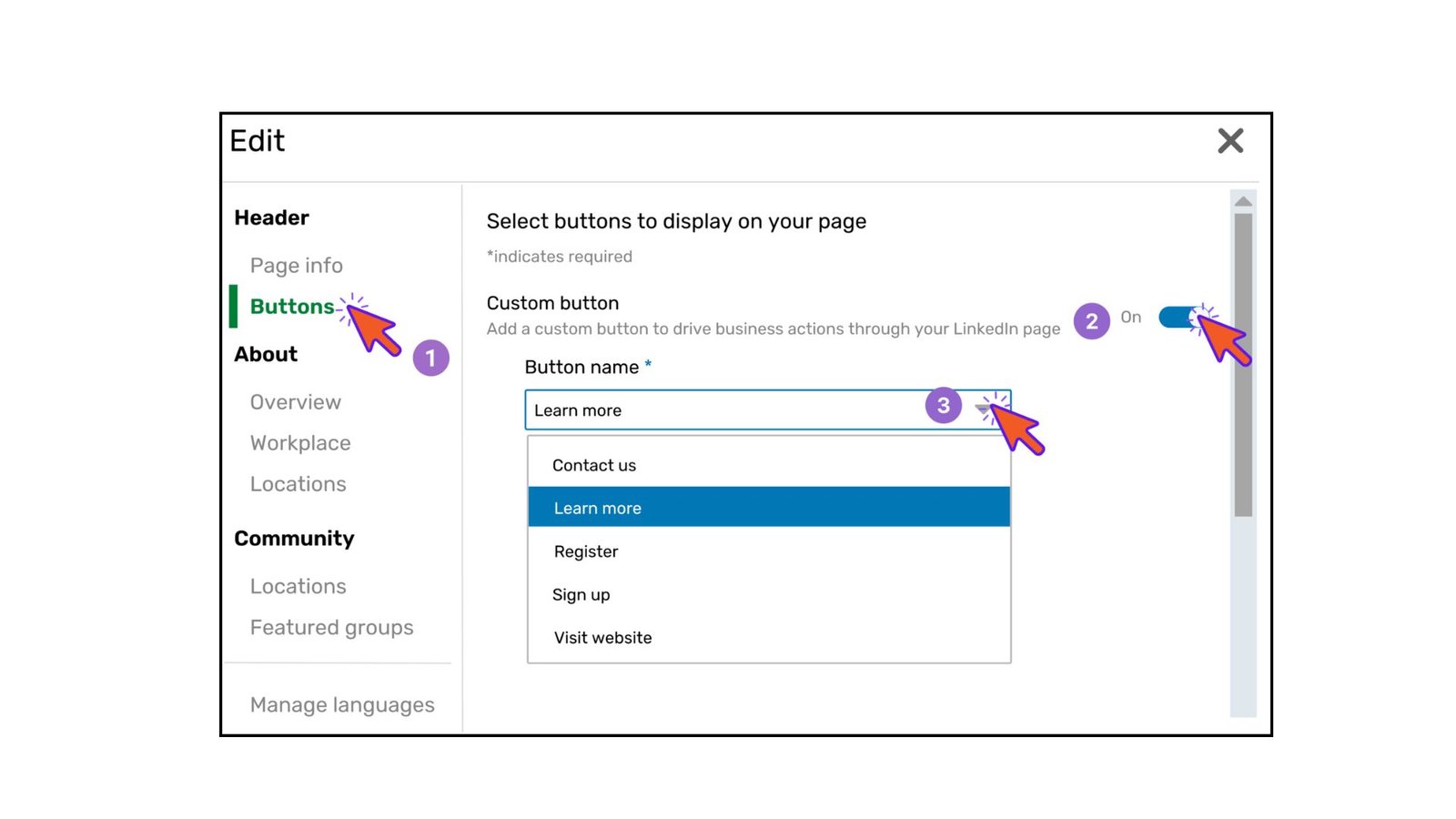- Customize your LinkedIn page’s CTA button to align with your business objectives.